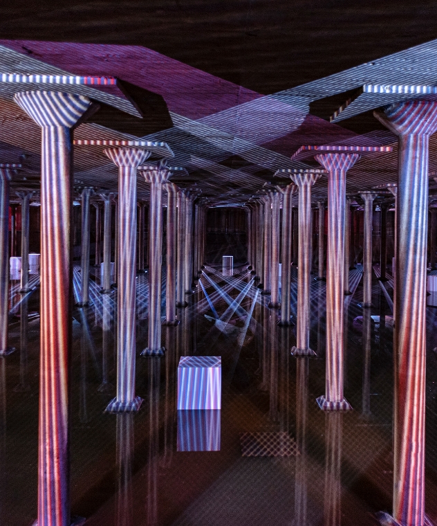 Carlos Cruz-Diez (1923-2019) at the Cistern: Spatial Chromointerference was a site-specific, ephemeral, and participatory work integrated into the architecture of the urban space. 32 projectors were placed in the Cistern to project moving lattices of light on the columns, interior walls, walkways and on cubes floating in the shallow pool of water on the Cistern floor. This aerial projection, reinforced by its reflection on the water, created a space where everything lost its materiality. Color became not merely a visual object to see but a space to be experienced.