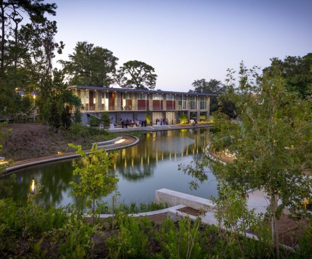 The late Houston landscape architect Charles Tapley originally designed this inspirational site in the late 1970s that now features a bayou tributary, riparian plantings, granite steps, seating areas, and a footbridge.